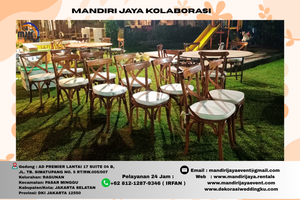 Mau acara kamu keliatan aesthetic dan mewah? CV Mandiri Jaya Kolaborasi siap wujudkan! Berawal dari rental kecil di Bekasi, perusahaan ini kini jadi vendor alat pesta kepercayaan ratusan klien Jabodetabek. Mereka spesialis sewa kursi crossback kayu jati yang elegan dan timeless.