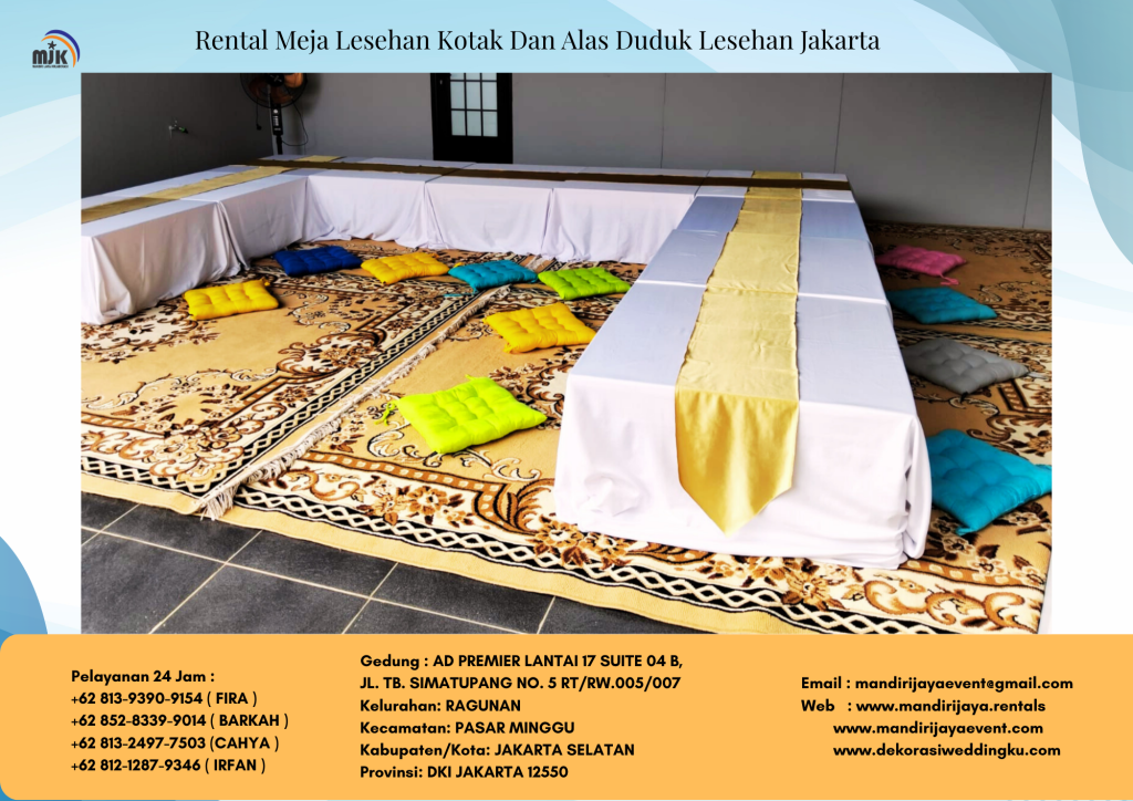 Ingin menggelar acara dengan konsep lesehan yang cozy tapi tetap berkelas? Sewa permadani coklat, meja bundar & bantal lesehan di Jakarta Timur dari CV Mandiri Jaya Kolaborasi jawabannya.